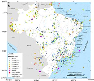 Brazilian earthquake data from historical and relatively recent instrumental records have been compiled through the earthquake catalog provided by the Seismology Center of the Institute of Astronomy Geophysics and Atmospheric Sciences of the University of São Paulo (IAG/USP). Further details on the earthquake catalog are presented [11]. Fig. 2 presents the location of the epicentres and magnitudes of the historical earthquakes covering a period from November 1720 to December 2019. It can be observed from Fig. 2 a concentration of epicenters in the Campos Basin, roughly across the continental slope [5].