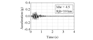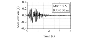 A series of artificial accelerograms were obtained using the criteria of the disaggregation analysis for earthquake scenarios as presented in Tables 1 and 4 presents in detail the criteria adopted for the generation of the synthetic accelerograms. Figs. 8 and 9 show examples of synthetic acceleration time-histories for two earthquakes of magnitudes 4.5 and 5.5 Mw , for a rupture distance of 10 km.
