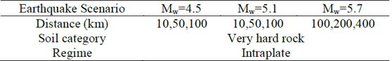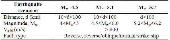 For the area of interest at the offshore Campos Basin, the most significant contribution comes from magnitudes 4.5 to 5.1 Mw at distances between 40 and 100 km. Regarding large earthquakes (magnitudes up to 5.7 Mw ) it was defined a contribution at distances up to 200 km [5]. There are few events accurately located in the Brazilian earthquake catalog, and the source-to-site distance estimated was at less than about 15 km. In addition, [2] reported an average distance of 10 km for oceanic source zones. Subsequently, the minimum distance used for the search criteria was reduced from 40 to 10 km. Given the stress regime in the Campos Basin, the failure mechanism considered reverse and normal faults, however, to include larger amplitude motions reverse and reverse/oblique faults were accounted in the search criteria. The target site rock condition of the uppermost 30 m of the earth crust (vs,30 ) was defined for vs,30 values higher than 800 m/s. With those criteria, three earthquake scenarios were defined, and the search parameters are shown in Table 1.
