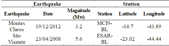 Given the lack of earthquake records in the continental margin of Southeastern Brazil by Ocean Bottom Seismometers (OBS’s), two earthquakes of particular interest were selected to obtain measured envelope shapes. The first earthquake selected occurred on May 19th, 2012, in the town of Montes Claros, Brazil, a region in which seismicity is not a recent occurrence [57]. The second earthquake occurred on April 23rd, 2008, 125 km South of the city of São Vicente, on the coast of São Paulo State. Both earthquakes were recorded by many stations of the Brazilian seismic network and well-detailed information about the mentioned seismic events was presented by [3] and [57]. Tables 5 and 6 show information about the selected events and the location of the stations that registered the accelerograms used for the analysis.