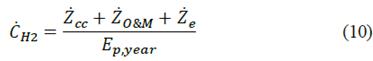 where Invact and Invref represents the investment cost of the actual and reference systems, respectively. In the same way, CPact and CPref refers to the system capacity of the actual and reference systems, respectively. Consequently thus, the hydrogen cost (CH2) can be estimated by means of eq. (10) [15]:
