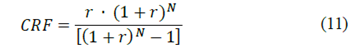 Where Zcc, ZO&M and Ze represents the annualized: capital cost, operation, and maintenance cost, and electricity cost, respectively Ep,year refers to the annual hydrogen production, which is calculated in the hypothetical scenario that the system constantly operates thorough the year. To levelized the costs on a yearly basis, the capital recovery factor (CRF) is introduced to account for time depreciation value. This parameter can be calculated as follows: