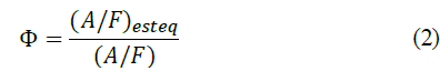 where PMair and PMfuel are the molecular weight of air and fuel, respectively. Similarly, mair and mfuel The term "𝑎" represents the stoichiometric molar value of oxygen. Relates the mass of air and fuel, respectively. The equivalence ratio (Φ) (eq. (2)) is used to quantitively parametrized if the air/fuel mixture is poor (Φ<1), rich (Φ>1) or ideal (Φ=1) [23]: