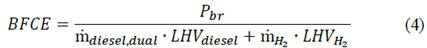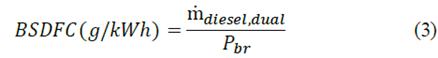 Where ṁ(diesel,dual) represents the mass flow of the dual-fuel and Pbr refers to the brake power. Notice that the brake specific fuel consumption (BSFC) indicates fuel consumption when the engine operates with pure diesel, and it is calculated employing eq. (3).