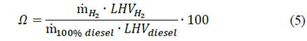 where LHV represents the low heating value of each fluid and mH2 relates the mass flow of hydrogen. Lastly, it is necessary to characterize the effect of the amount of hydrogen that is being replaced. Hence, the hydrogen energy sharing (Ω) is a non-dimensional parameter that relates the ratio between the energy provided by hydrogen enrichment and the required energy for a stand-alone diesel operation mode [23]: