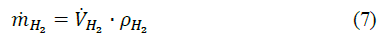 Notice that oxygen production accounts to be half of that of hydrogen. In the experimental test bench, the volumetric flow of hydrogen (VH2) is measured with a flow meter, thus the mass flow rate (mH2) can be obtained via eq. (7).