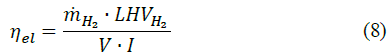 where ρH2 refers to the hydrogen density. Finally, the electrolyzer efficiency is introduced by eq. (8) to evaluate the overall performance [25].