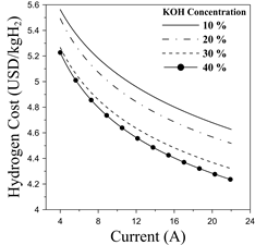 The results indicate that cost of hydrogen production features a decreasing trend as the current increases. Additionally, higher electrolyte concentrations enable significant reductions in the overall cost. This pattern supported the results obtained from the last section. The overall cost varies from 4.23 USD to 5.58 USD, which is congruent with similar studies [2,7]. The results demonstrate that alkaline electrolyzers are competitive with other technologies such as PEM and solid oxide electrolyzers [1].