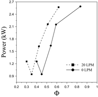 This section aims to discuss the essential aspects related to the combustion phenomena when operating in dual-fuel mode. Fig. 11 describes the power output behavior as a function of the equivalence ratio (Φ).