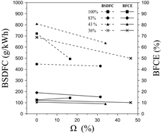 To verify the influence of the operating margin and the dual-fuel operation, the fuel consumption metrics are analyzed. Fig. 12 displays the influence of the hydrogen energy share (Ω) on the BSDFC and the BFCE at different load rates.