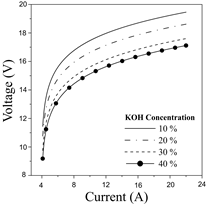 The results indicate that higher KOH concentration enhances the performance of the electrolyzer since less voltage is required to dissociate the water molecules. This pattern can be associated with the higher electrolytic conductivity that promotes reaction kinetics at the electrodes [26]. Overall, the cell voltage can be reduced between 4-15% by increasing the KOH concentration from 10 to 40 %p/p, which demonstrates the great dependence of the electrolyte concentration. Afterward, Fig. 7 shows the behavior of hydrogen production in the electrolyzer.