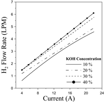 According to the results of Fig. 7, the hydrogen production features a direct relation to the operating current, whereas greater electrolyte concentrations boost the overall flow rate. However, the relative difference is limited to low-medium currents. Particularly, 40% and 30% electrolyte concentrations experience the highest production outcome.