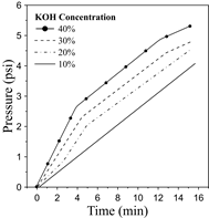 Based on the results, the hydrogen pressure experiences the best performance as the electrolyte concentration decreases. The pressure of the hydrogen produced increases over time until it reaches the maximum pressure of the storage tank (15 psi). These results are key to evaluate the performance of the electrolyzer, especially in the start-up stage. The findings are consistent with the overall behavior reported by Kumar and Himabindu [6]. The parametric analysis performed from the experimental assessment demonstrates that the 30 %p/p KOH concentration features the best performance since both hydrogen production and electrolyzer efficiency remain at the highest levels. Even though the parameters mentioned above are slightly higher for a 40 %p/p at some operating range, the hydrogen pressure features the worst performance from the cases analyzed.