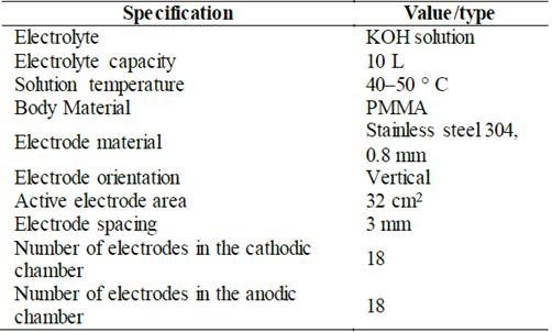 The hydrogen production within the experimental test bench is powered by a monopolar alkaline electrolyzer displayed in Fig. 3. The main features of the in-house designed electrolyzer are listed in Table 3. Notice that only the hydrogen flow is implemented in the analysis. Therefore, the oxygen is stored in a tank.