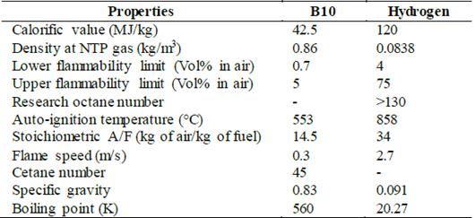 The study incorporates a dual-fuel operation mode for the diesel engine. Accordingly, a biodiesel blend of palm oil was mixed with pure diesel in a 10:1 proportion (B10). In addition, hydrogen enrichment is incorporated by intake air injection in volumetric a volumetric flow of 20 LPM. The selection of the volumetric flow is validated with the autodetonation tendency, as outlined in Section 3.2. The main properties of each of the tested fuels are listed in Table 4.
