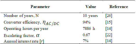where ηAC/DC refers to the AC/DC converter efficiency, and τ is a constant that relates the electricity capacity factor at the given power condition. Table 7 list the main assumptions within the analysis.