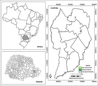 This study was conducted in two green areas located in the city of Curitiba: the Francisca Maria Garfunkel Rischbieter Botanical Garden (from now: Botanical Garden) and the São Lourenço Park. Curitiba is located in the southern region of Brazil (Fig.1), with ground-zero at the coordinates 25º25'40” S and 49º16'23” W, with an average altitude of 934.6 m [15].