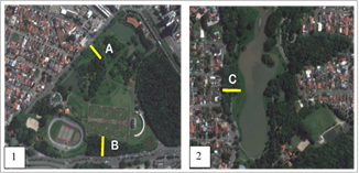 The Botanical Garden covers an area of 178,000 m² and is located in the eastern portion of the city on the edge of the Botanical Garden neighborhood with the BR-116 highway, at 25º26'31” S and 49º14'19” W, bordered by the Prefeiro Maurício Fruet and Prefeito Lothário Meissner avenues, the Engenheiro Ostoja Roguski street, and a railroad [19]. São Lourenço Park is located in the northern part of Curitiba and has an area of 203,918 m² [20]. It is located at the geographical coordinates of 25°23'01,983” S and 49°15'58,235” W. The park is bordered by the Mateus Leme (to the west), José Brusamolin (to the north), and Professor Nilo Brandão (to the south) streets.