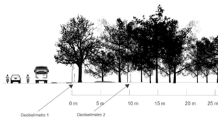 The method proposed by Oliveira et al. (2018) was used to assess the influence of green areas on noise reduction, by which two sound pressure level readers/decibel meters model DEC-470 (accuracy of ± 1.5 dB) recorded environmental sound at distances of 0, 5, 10, 15, 20, 25, 30, 35, 40, 45, 50, 55 and 60 m in the three monitoring sites (A, B, C), as previously described (Fig.3). Simultaneous measurements were performed in two different conditions: one at the source of the noise on the edge of the avenue, and the other at different distances from the source, with three repetitions (5 min of collection, each 30 seconds apart) [6].