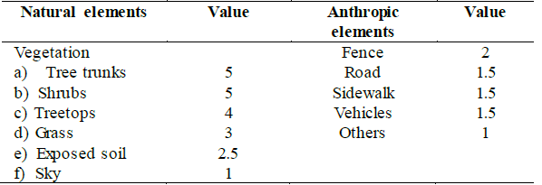 Each photograph was evaluated according to the percentage of natural and anthropic elements of the landscape in each grid. Each element received a weight (Table 1) related to the levels of anthropic presence. The less anthropized elements received higher weights, and those which showed a higher degree of anthropization received lower weights [6,20,24].