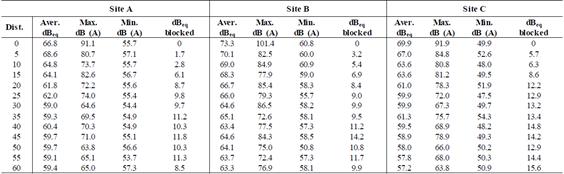 The differences between the sound pressure level (dBeq) at the distance of 0 m with the other distances tested in each transect were calculated to assess the influence of the locations on noise pollution blockage.