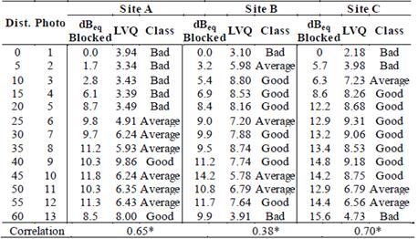 The Statgraphics version 16.2 software program was used to evaluate the correlation between the methods of visual and sound assessments, where the average LVQ value of each tested distance together with the final average of the noise blockage were compared. An intensity classification was used for the correlation analysis, which defines the correlation intensity classes as: null (0.00 - 0.03), weak (0.03 - 0.35), medium (0.35 - 0.65), strong (0.65 - 0.95), very strong (0.95 - 0.99) and perfect (1.00) [25].