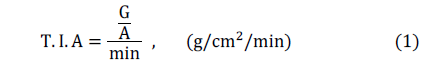 This property is the capillary absorption capacity of the dry samples measured during 1 min. The water absorption is directly related to the porosity of the elements subject to test and the quality of the raw materials. When the values of absorption of water are low, this suggests a minimum capacity for collecting humidity from the environment; besides, it indicates good mechanical properties on the behavior of the clay used Eq. 1 was used to estimate the initial rate of water absorption according to the NTC 4017 standard procedure [27], where: T.I.A is the initial absorption rate, G is the difference between the initial and final weighing per min, and A is the contact area with water.