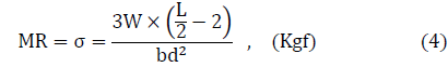 Where: MR is the sample breaking module, W is the maximum load indicated by the test machine (N), L is the distance between the supports (mm) (measured from center to center), b is the net width (face-to-face distance) of the sample in the fault plane (mm), and d is the depth, (distance from the top face to the bearing plane) of the sample in the fault plane (mm).