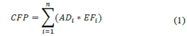 Where CFP is the Carbon Footprint of the organization, derived from the process of consumption of goods and/or services (kg of CO2-eq); ADi, the data on source activity i (based on a unit of measurement); and EFi, the emission factor of source i (kg CO2-eq/unit of measure).