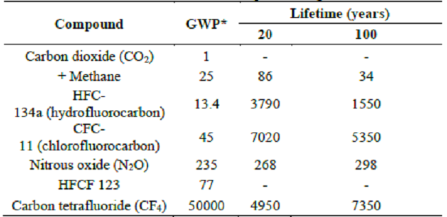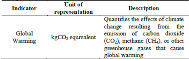Table 1 shows the description and unit used here to represent the impact category called Climate Change or Global Warming, according to reference [18].