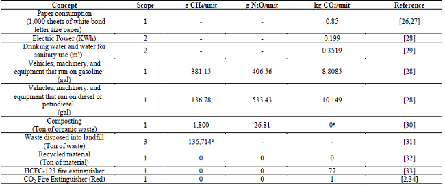 Before calculating ITM’s Carbon Footprint, all the anthropogenic GHG emissions from inside the organization must be estimated (CO2, CH4, N2O, HFC, PFC, and SF6). Subsequently, this information was converted into equivalent CO2 emissions (kg CO2-eq) with the Global Warming Potential (GWP) [19,20]. Table 2 shows the conversion factors of different GHGs to equivalent kg of CO2 according to the references [21,22].