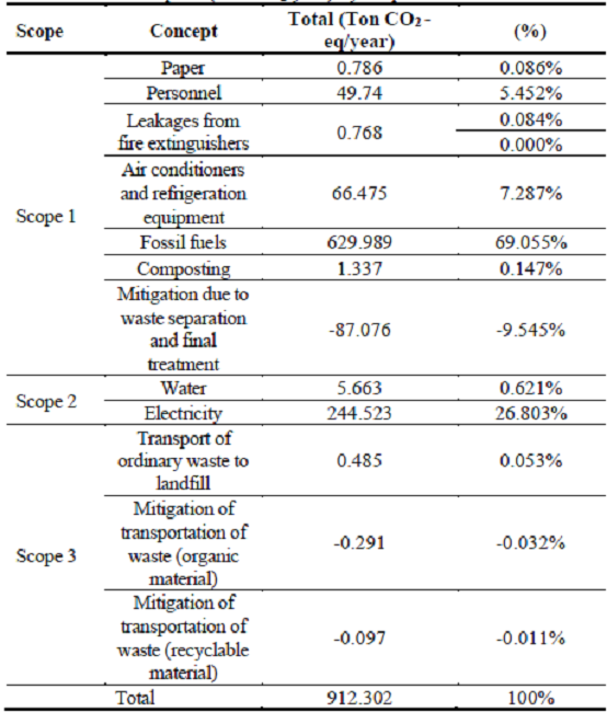 Table 4 shows the Total Carbon Footprint (Ton CO2-eq/year) of each scope and the contribution of each item to this sustainability indicator.