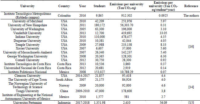 Although it is difficult to compare the carbon footprint of different institutions, Table 5 shows the calculated Total Carbon Footprint (Ton CO2-eq/year) and the specific Carbon Footprint per student at several universities and higher education institutions in the United States and Latin America.