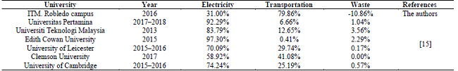 Waste: Composting and mitigation due to waste separation and final treatment (Scope 1), transport of ordinary waste to landfill, and mitigation of transportation of organic and recyclable material (Scope 3).Table 6 compares the emission weights of electricity, transportation, and waste of several universities, including ITM Robledo campus.