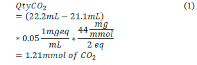 Where: QtyCO2 = is the quantity of CO2 expressed in mmoles. Vtit(Ba(OH)2 ) = titrant volume used in “CO2 gas trap”, each occasion, in mL. VtitSustProb= titrant volume, in mL. [HCl]= titrant concentration, normality (N) of 0.05
