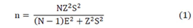 La unidad de muestreo escogida fueron las manzanas, y al obtener el porcentaje de establecimientos comerciales dentro de las mismas, se calculó de manera proporcional con respecto al número de muestras (encuestas) a realizar, el total de encuestas a ejecutar por manzana. Asimismo, se excluyeron del cálculo todos aquellos recintos institucionales, iglesias, centros médicos y estaciones de gasolina. La fórmula para calcular el tamaño óptimo de muestra cuando se conoce el tamaño de la población [14], fue la siguiente: