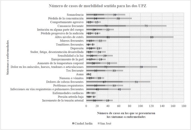Los síntomas y enfermedades evidenciadas en ambas UPZ con cantidades de casos muy cercanos (comportamiento agresivo, pérdida progresiva de la audición, altos niveles de estrés, temblores frecuentes, depresión, enrojecimiento de la piel, tos frecuente, nauseas o vómitos, problemas respiratorios, infecciones en las vías respiratorias o pulmonares frecuentes, y presión arterial baja), podrían relacionarse con otros factores, tales como: edad, hábitos, factores ambientales de su entorno, horarios de trabajo extensos, entre otros.