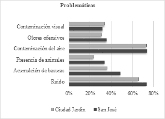 Por otro lado, se tiene un segundo grupo, donde se encuentran problemáticas evidenciadas con un menor porcentaje de importancia: contaminación visual (34% y 32%), olores ofensivos (31% y 36%), presencia de animales (26% y 34%), acumulación de basuras (36% y 48%). (Fig. 2)