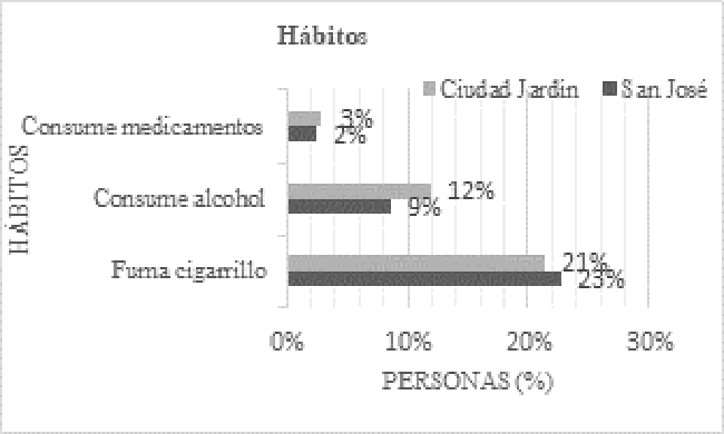 Por otra parte, si se analizan los hábitos de los habitantes de las dos UPZ a comparar, no se encuentran grandes diferencias, en ambos casos se denota un porcentaje mayor de personas fumadoras (hasta un 23%) con respecto a las que consumen alcohol (hasta un 12%) y en un porcentaje mucho menor para quienes consumen medicamentos (hasta un 3%). (Fig. 3).