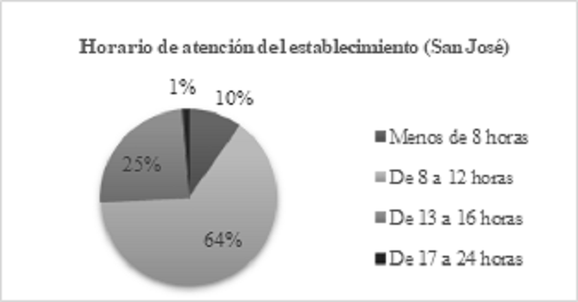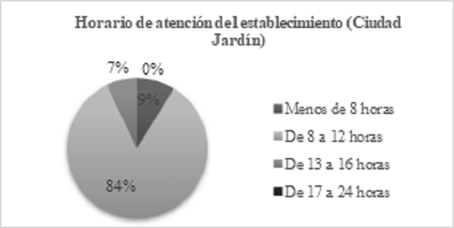 Asimismo, los horarios de atención de los establecimientos encuestados, en su gran mayoría son de 8 a 12 horas (84% Ciudad Jardín y 64% San José), lo que puede causar una serie de problemas en la salud de los trabajadores, como lo han demostrado diversos estudios a nivel mundial, entre los cuales se pueden nombrar: ansiedad, riesgo de obesidad, entre otros sin relación con los datos recogidos a partir de las encuestas, aunque de igual manera se evidencian enfermedades y síntomas en común como: la depresión, problemas cardiovasculares e insomnio. Por otro lado, horarios más extensos: de 13 a 16 horas (7% Ciudad Jardín y 25% San José), con mayor afectación individual a la salud, pero una menor incidencia en la población en general, ya que se presenta en una cantidad menor de establecimientos; de 17 a 24 horas (0% Ciudad Jardín y 1% San José) con una cantidad despreciable de casos; y por último, horarios de menos de 8 horas diarias (9% Ciudad Jardín y 10% San José) no representan un riesgo para la salud de las personas (FigS. 4, 5). [30].