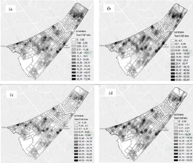 Por otro lado, frente a la salidas graficas se logra visualizar una disminución de la huella de carbono principalmente para Ciudad jardín y San José, tanto para la interpolación con IDW como Kriging, con la diferencia de que al transformar la interpolación de tipo Kriging a raster cambia la amplitud de los valores en la escala, ya que esta interpolación utiliza un suavizado para reducir el error en la estimación de los valores, ocasionando que el mapa no represente el valor real de la huella de carbono y por ende los datos finales se vean alterados. [33] (Fig. 6b, 6d).