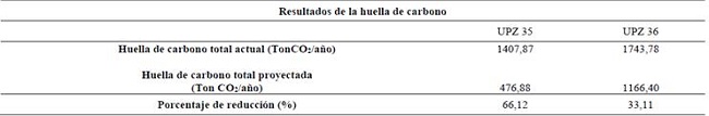 El diseño del sistema fotovoltaico logró reducir en un 66,12% y 33,11%, la huella de carbono producida por las UPZ 35: Ciudad Jardín, y UPZ 36: San José, respectivamente, vemos entonces, que existe una mayor reducción para la UPZ 35, debido a que posee una cantidad considerable de espacio en sus terrazas, y su consumo es mucho menor al consumo de la UPZ 36, ya que la diferencia entre las dos es de aproximadamente 336 Ton CO2/año, debido a que esta UPZ es mucho más grande que Ciudad Jardín.