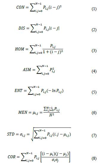 The GLCM textural variables calculated were Contrast (CON), Dissimilarity (DIS), Homogeneity (HOM), Angular Second Moment (ASM), Entropy (ENT), Mean (MEN), Standard Deviation (STD), and Correlation (COR). These variables are defined as shown in eq. (1)-(8) respectively