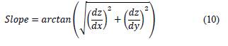 Slope is the inclination of a given point on a topographic surface [32]. This was calculated from the DSM according to eq. (10),
