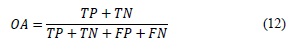 where TP are the correctly classified objects; TN, the correctly non-classified objects; FP, the classified objects in a class that was not the true one; and FN, the non-classified objects in the true class [42].