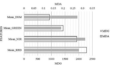The MDA and MDG importance indexes are shown in Fig. 5, where it is revealed that the best attributes are MeanNIR and MeanRED. MDA values of 0.32 and 0.27 for MeanRED and MeanNIR, respectively, indicated the decreased degree in accuracy with the absence of these attributes. On the other hand, MDG values of 2230 and 2000 for MeanNIR and MeanRED, respectively, indicated the impact that the exclusion of the attribute has on the speed of the RF decision in the classification.