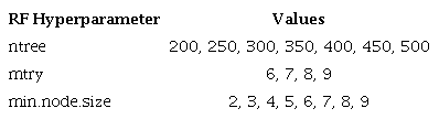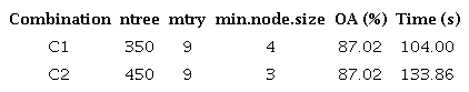 Once the optimal set of attributes was obtained, we adjusted the RF hyperparameters for subsequent classification. We simultaneously adjusted the ntree, mtry and min.node.size hyperparameters , whose values can be seen in Table 9.