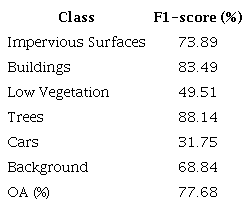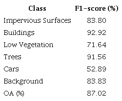 We obtained an OA value for the classification of 87.02%. The land-cover classes with the highest thematic accuracy (F1-score) ate Buildings, Trees, Background and Impervious Surfaces with92.92%, 91.56%, 83.83%o 83.80%, respectively. Moreover, we found that the lowest values of the F1-score were presented in the Cars and Low Vegetation classes, with values 52.89% and 71.64%, respectively.