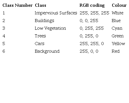 The GT was obtained from ISPRS [28] in TIFF files with three bands (red, green, and blue - RGB), which were only assigned values of 0 and 255, this to be able to encode the six classes in which the areas are classified and described in Table 2.
