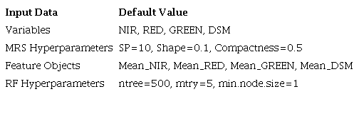 In phase 0, we do not perform processing on the TOP and DSM bands, which we take as input data for segmentation. For phase 1, we use the default values of MRS algorithm to generate the segmented objects. In phase 2, we calculate the object attributes corresponding to the mean response of each variable in each object.